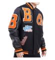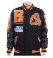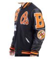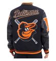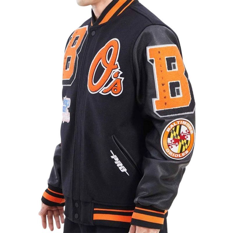 Show your team pride with the Baltimore Orioles Varsity Jacket, crafted from a durable wool body with leather sleeves. Featuring a cozy viscose lining, snap-tab over zipper closure, and rib-knitted collar and cuffs, it combines comfort and style. With two outside and two inside pockets, this black jacket is perfect for game days or casual wear.