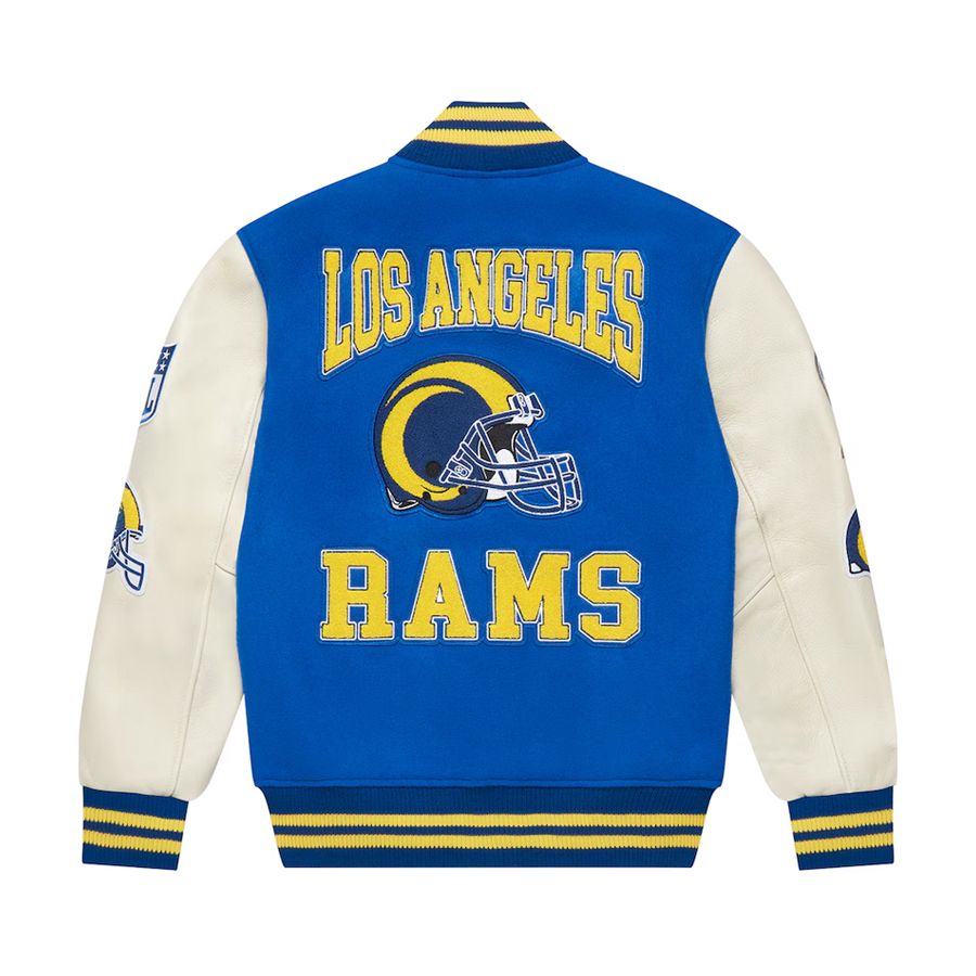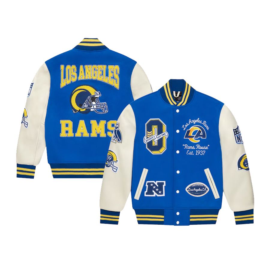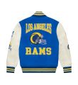 To top it off, the jacket proudly showcases the iconic Los Angeles RAMS logo on both the front and back, making it the perfect piece for fans who want to represent their team in style. Whether you're at a game or out with friends, this varsity jacket effortlessly combines comfort, functionality, and team spirit.