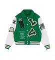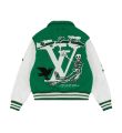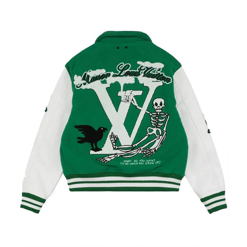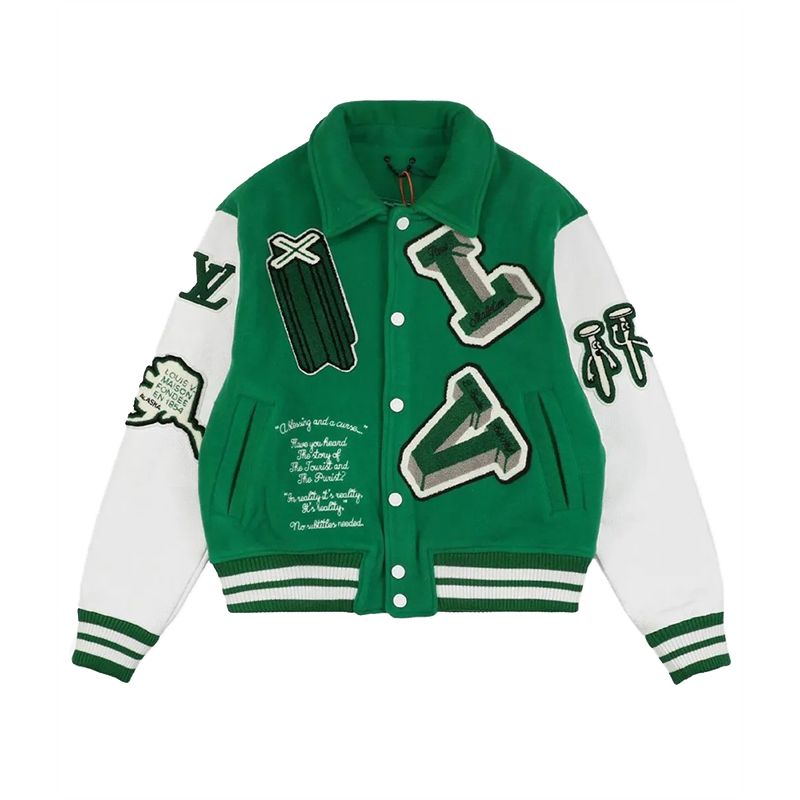 The green Louis Vuitton letterman jacket is crafted from high-quality wool, with sleeves made from genuine leather. Its vibrant green and white color combination gives it a fresh and stylish look. The jacket features a shirt-style collar and a buttoned front closure. A soft viscose inner lining ensures warmth and comfort. The long sleeves are fitted with rib-knitted cuffs, and there are two side waist pockets for convenience. The jacket is adorned with embroidered and graphic patches on the front, back, and sleeves. The fine quality stitching enhances the durability and comfort of the jacket, making it ideal for bike riding or a night out with friends.